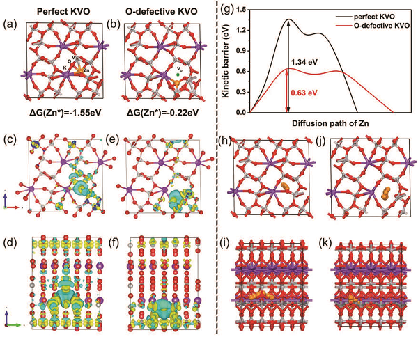 图5. (a)纯KVO和(b)氧缺陷KVO 的Zn2+吸附结构几何形状(正视图),每种结构下均显示了Zn2+吸附的吉布斯自由能,(c-d)纯KVO和(e-f)氧缺陷KVO嵌入Zn2+的电荷密度差,(g)纯KVO和氧缺陷KVO结构中路径的计算扩散势垒,(h,i)纯KVO和(j,k)氧缺陷KVO的Zn2+扩散途径。