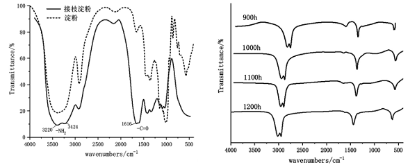 通过红外光谱法可以研究聚合物分子链的组成、结构、构型等,还可以研究聚合物在一定的条件下分子结构发生的变化,如老化、硫化、固化等。李圆等[5]将丙烯酰胺和淀粉通过接枝共聚形成聚合物凝胶体系。图5中新的吸收峰证明丙烯酰胺单体成功地接枝到了淀粉本体上。黄亚曦等[6]对聚乙烯薄膜进行紫外线老化实验。图5右图表明样品在紫外照射1200 h后的红外光谱图中羰基峰面显著减小,可以认为在此时样品分子链开始老化断裂。