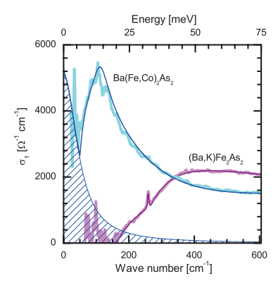 Ba0.6K0.4Fe2As2的光电导谱在大约160 cm-1以下降为0,说明超导能隙是s波对称的,能隙中不存在未配对的准粒子。而Ba(Fe0.92Co0.08)2As2的光电导虽然在低频下出现了很陡的下降(表明超导能隙的打开),但没有降至零。低频的光电导谱仍然需要一个Drude分量来描述(代表未配对准粒子),如图中蓝色阴影部分所示,这说明超导能隙中存在大量的未配对载流子。