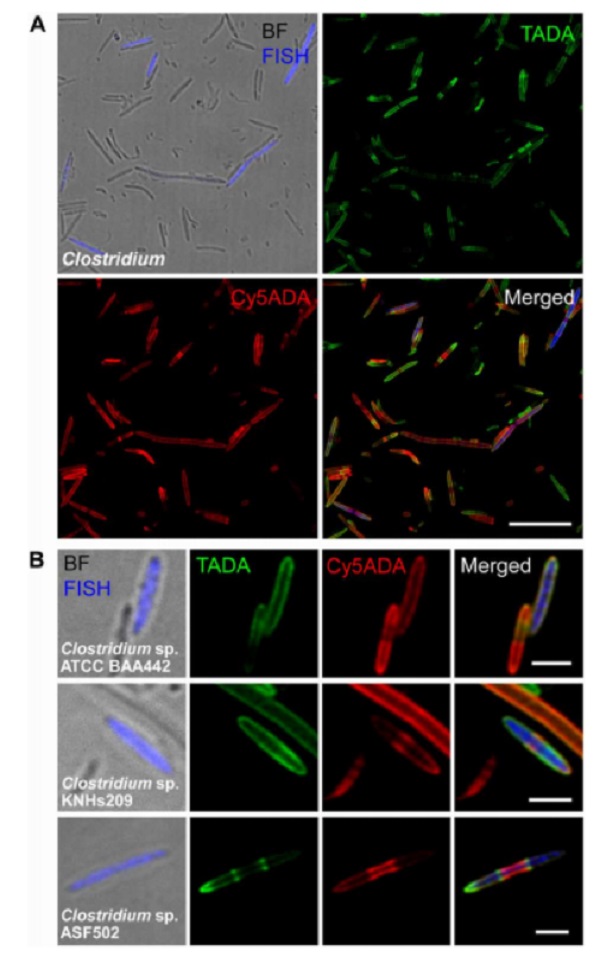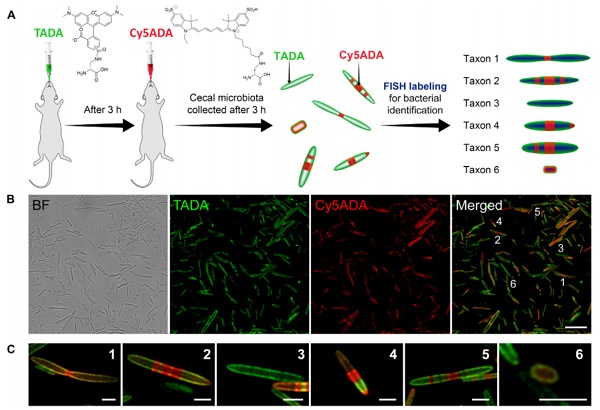 (B)依次用TADA(绿色)和Cy5ADA(红色)标记的肠道细菌的双色荧光成像