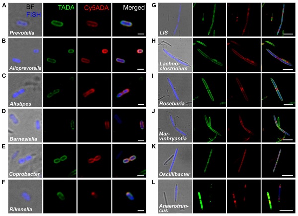 图3.共聚焦荧光成像的12种FDAA标记和FISH染色的肠道细菌属