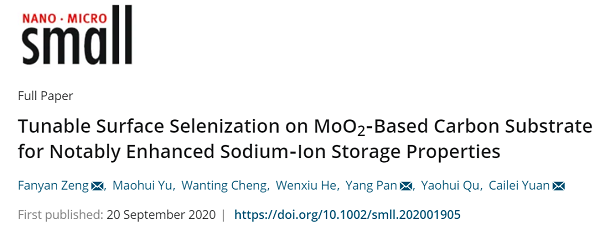 文献链接:https://onlinelibrary.wiley.com/doi/10.1002/smll.202001905, “Tunable Surface Selenization on MoO2-based Carbon Substrate for Notably Enhanced Sodium-Ion Storage Properties” (Small, 2020, https://doi.org/10.1002/smll.202001905)