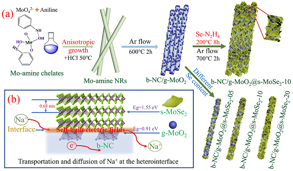 图一:b-NC/g-MoO2@s-MoSe2的制备过程和钠离子在异质界面(MoO2@MoSe2)中的传输