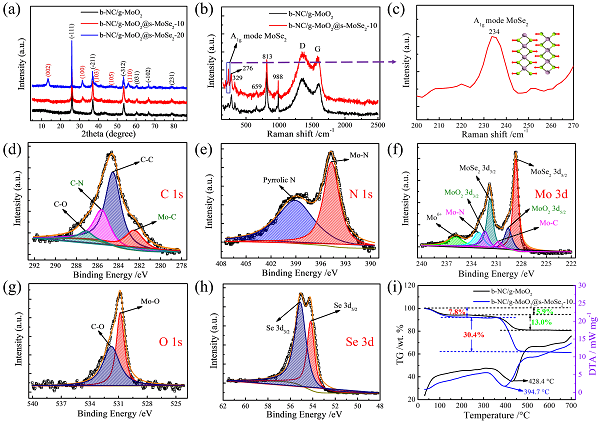 (b-c) b-NC/g-MoO2@s-MoSe2-10及其对比材料的Raman图;