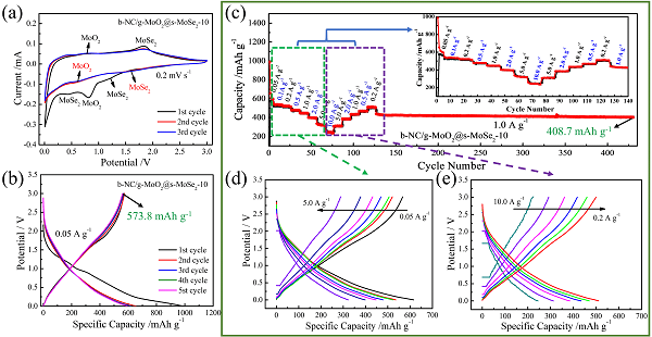 (c) b-NC/g-MoO2@s-MoSe2-10的倍率性能图及其对应的不同电流密度下的(d-e) 恒流充放电曲线。