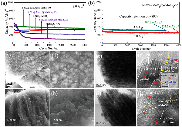 (g-j) b-NC/g-MoO2@s-MoSe2-10经5000次循环后的Ex-situ SEM和TEM图。