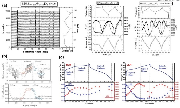 (c)通过原位中子技术获得的具有高锂含量(HLR)和低锂含量(LLR)的LMRO初始周期中a和c的演变。