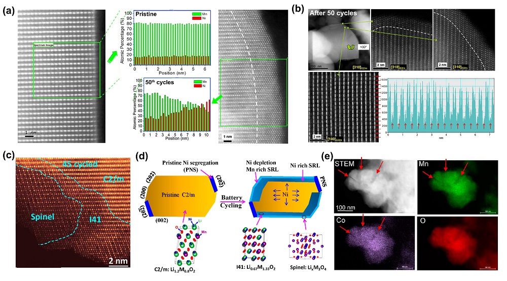 (d)循环Li1.2Ni0.5Co0.1Mn0.55O2电极中隐蔽孔的STEM-EELS映射,表明在电极主体中出现尖晶石状相。