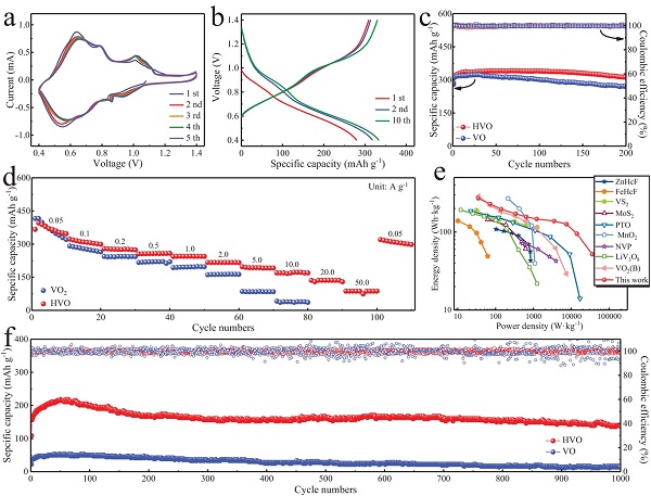 (d)电流密度为0.05~50 A g-1的HVO和VO阴极的倍率测试。