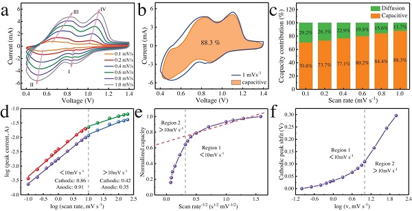 (c)不同扫描速率下电容和扩散贡献的百分比。