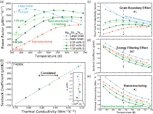 (a)高能电子对赛贝克系数的贡献高于低能电子(Applied Physics Reviews 5, 021303 (2018))。通过改变晶界处的能带结构造成能带势垒,可以有效“过滤“低能量电子,增加晶界相的赛贝克系数。(b)材料中声电子输运示意,晶界相造成低能量电子的散射效应,石墨烯的加入增强了晶界相对声子的散射效应。(c)到(e)基于有效介质理论建立的串联模型对材料中的声电子输运进行分析。晶界相对比晶相有更高的电阻和热阻,造成额外的电压降(c左)和温差降(d左)。石墨烯的加入在不影响电子输运的情况下有效增加了晶界相的界面热阻。晶界相界面热阻的增加直接导致晶界相温差降的增加(d),从而产生更大的界面赛贝克电压(e)。