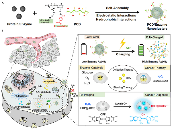 蛋白质类药物在市场上占有很大的份额,在许多疾病的治疗中有着广阔的前景。然而,由于针对细胞内环境的蛋白转导和活性调节效率低下,现有的蛋白药物局限于细胞外靶点。在本研究中,中国医药大学Minjie Sun教授等人构建了ATP充电平台来克服上述癌症药物的障碍。合成了苯基硼酸修饰聚乙二醇(PCD),并与酶结合,保护其在血液循环中的活性。当PCD纳米团簇到达肿瘤部位时,它们有效地将酶运输到细胞中,然后在ATP充电后恢复其催化活性。重要的是,级联酶系统(GOx&HRPA)选择性地诱导饥饿治疗以及肿瘤的光声成像。结果表明,该智能纳米团簇可广泛应用于蛋白转导和酶活性调节,可加快蛋白药物向细胞内靶点的临床转化。相关研究以“ATP-Charged Nanoclusters Enable Intracellular Protein Delivery and Activity Modulation for Cancer Theranostics”为题目,发表在iScience上。