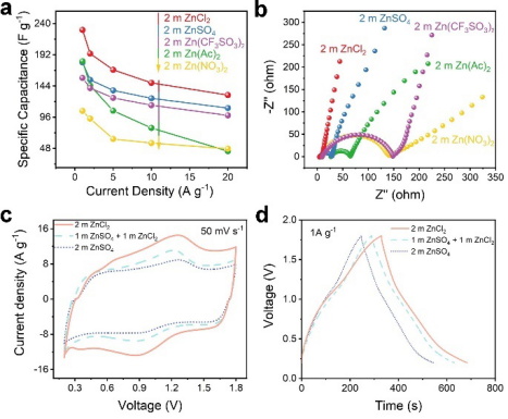 图1. 基于活性炭电极的锌离子混合电容器在不同锌盐水溶液中的电化学性能