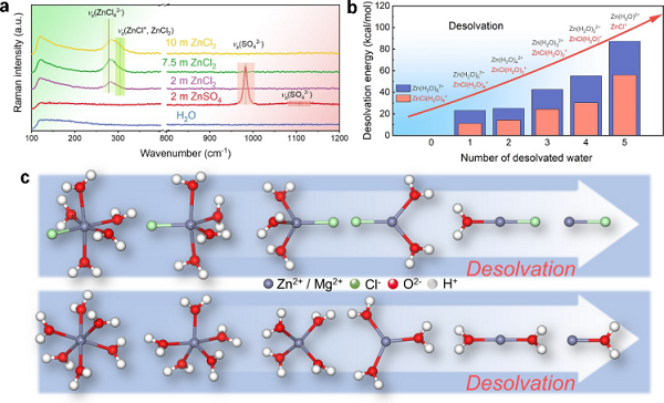 a)不同浓度氯化锌溶液,硫酸锌溶液和去离子水的拉曼光谱;b) [Zn(H2O)6]2+ 和 [ZnCl(H2O)5]+水合离子基团的分步去溶剂化能; c) [Zn(H2O)6]2+ 和 [ZnCl(H2O)5]+去溶剂化中间产物的分子空间构型。