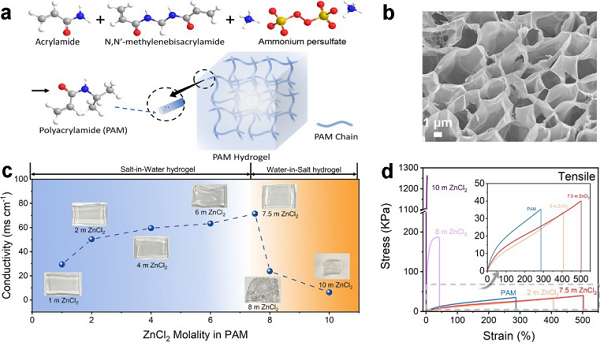 a) PAM水凝胶的合成示意图;b) 冻干PAM水凝胶的形态;c) 不同浓度氯化锌填充的PAM的离子电导率和对应PAM的外观;d) 25 oC下不同浓度氯化锌填充的PAM凝胶电解液的拉伸性能。