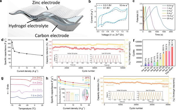 a) 柔性锌离子混合电容器结构;b) 不同电位窗口的循环曲线;c) 恒流充放电曲线;d) 质量比电容;e) 5 A g-1的循环性测试; f) 与其他锌离子混合电容器的循环寿命对比;g) 不同浓度氯化锌填充的PAM在2 °C min-1的差示扫描量热法测试;h) 不同温度下的质量比电容, 插入图为不同温度下的电解质离子电导率, 电解质导电点亮LED灯示意图; i) -20 oC下在5 A g-1的循环寿命测试。