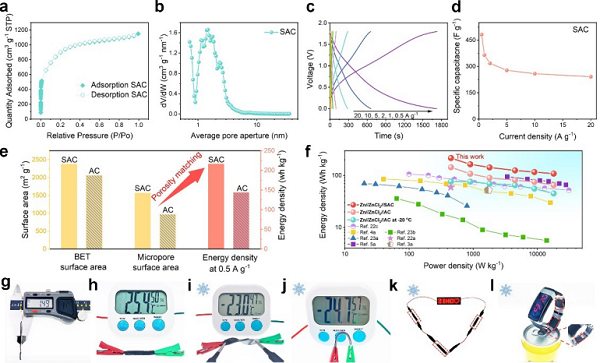 a) SAC在77 K下的氮吸附-解吸等温线;b) SAC的孔径分部;c) 基于SAC的GCD曲线; d) 基于SAC的质量比容量; e) SAC和活性炭的比表面积,微孔面积,以及对应器件在5 A g-1的能量密度; f) 本文与其他锌离子混合电容器的Ragone图对比; g) 器件的厚度;h-l)不同条件和温度下的实用范例。