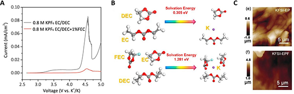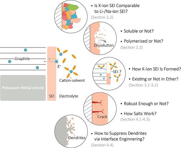 钾离子电池(PIBs)因钾资源自然丰度高、成本低廉和电极电位(-2.93V)低,成为大规模储能的候选体系而备受关注。溶剂化钾离子较小的斯托克斯半径决定了PIBs电解液具有较快的离子传输能力,此外,K+可以可逆地嵌入/脱出石墨,使锂离子电池(LIBs)负极石墨材料在PIBs中应用成为可能。固态电解质界面(SEI)被认为是LIBs中最重要的界面,它来源于负极材料与电解液在固液相界面上的反应。SEI对电池的库仑效率、循环稳定性及安全性都具有至关重要的作用。从石墨负极、硅负极到其他氧化物负极材料,SEI层在LIBs中被广泛研究。然而,目前对PIBs的SEI研究非常有限,理解严重不足,这阻碍了PIBs的发展。