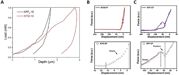 (A)在KPF6和KFSI基电解质中循环的Bi/rGO电极的载荷-位移深度曲线分析;