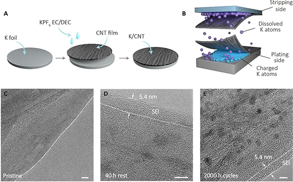 (D和E) 在K箔静止40h和2000h循环后,表面CNT的TEM图像;