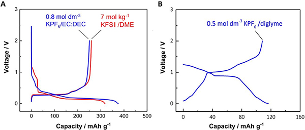 (B)石墨负极在低浓度醚类电解质的充放电曲线。