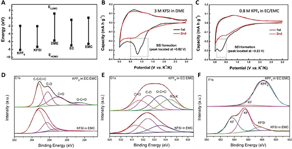 (A) 钾盐(KPF6和KFSI)和溶剂(DME、EC和EMC)的HOMO和LUMO能级;