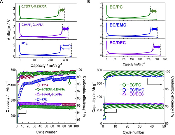 (B)在0.9KPF6/0.1KFSI的固定盐比例条件下,用不同溶剂填充K||石墨电池的充放电曲线,可逆容量和库仑效率。