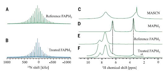 针对这一问题,洛桑联邦理工学院的Michael Grätzel、Anders Hagfeldt联合复旦大学的Yiqiang Zhan、Lirong Zheng(共同通讯作者)等人报道了基于MA thiocyanate(MASCN)或者FASCN气相处理的新型沉积策略,利用该策略可以将δ相FAPbI3钙钛矿薄膜转变成高纯度的α相FAPbI3。在该项工作中,研究人员利用NMR定量了材料框架中的MA吸收量,并利用分子动力学模拟揭示了硫氰酸根阴离子能够在热力学相转变温度以下提高α-FAPbI3的形成和稳定性。检测显示,由这类低缺陷密度α-FAPbI3薄膜制作而成的太阳能电池具有超过23%的能量转换效率和长期的运行/热稳定性。2020年10月02日,相关成果以题为“Vapor-assisted deposition of highly efficient, stable black-phase FAPbI3 perovskite solar cells”的文章在线发表在Science上。