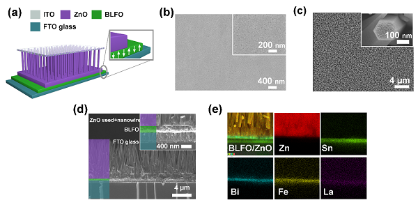 图1:通过磁控溅射和水热法制备出BLFO/ZnO纳米线异质结。通过SEM测试证明器件制备良好。