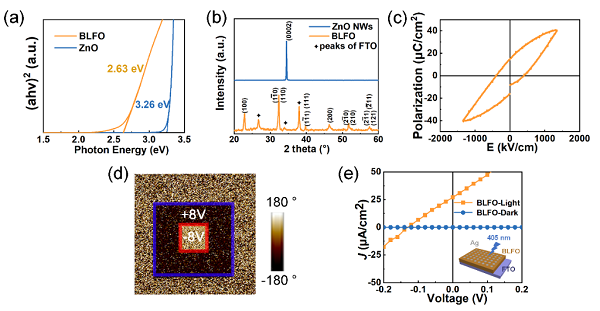 图2 BLFO薄膜和ZnO纳米线的(a)带隙拟合以,(b)及XRD图谱; BLFO薄膜的(C)电滞回线和(d)PFM测试;(d)BLFO薄膜的铁电光伏性能测试。