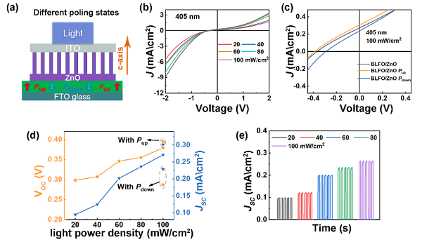 图3 (a)不同光功率密度下的测试示意图;BLFO/ZnO异质结在不同光功率密度下的(b)J-V曲线,和(c)40mW/cm2 光功率密度下不同极化状态下的J-V曲线;(d)不同测试条件下的光伏特性;(c)不同光功率密度下的on-off测试。