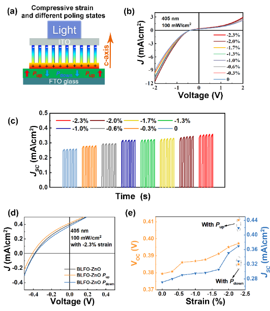 图4 (a)对器件施加光场、外电场和应变场测试设置示意图;(b)器件在405 nm光源,功率密度为100 mW/cm2的光源下加不同应变的测试结果和(c)on-off测试;(d)-2.3%压应变下,不同极化条件下的BLFO/ZnO的J-V曲线;(e)器件不同测试条件下的测试结果。