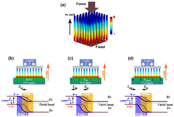 王中林院士提出的压电光电子学效应是同时具有半导体、光激发和压电特性耦合效应形成的新领域,为构筑新型压电-光电纳米器件打下了坚实的理论基础。 压电光电子学效应利用压电势调控器件界面或结区的能带结构,进而调控界面和结区处载流子的分离、输运与复合过程,从而调控器件的光电性能,实现力-光电的协同效应,利用压电光电子学效应可以制备同时具备高性能、高灵敏和高分辨率特点的新型光电子器件,有望满足后摩尔定律时代对于可穿戴便携式电子器件的多样性和多功能性的需求。由于所选材料性质上的巨大差别,传统研究领域与压电光电子学效应的交叉研究十分有限。利用压电光电子学与铁电极化的共同作用提高异质结的光伏性能具有重要的研究价值。