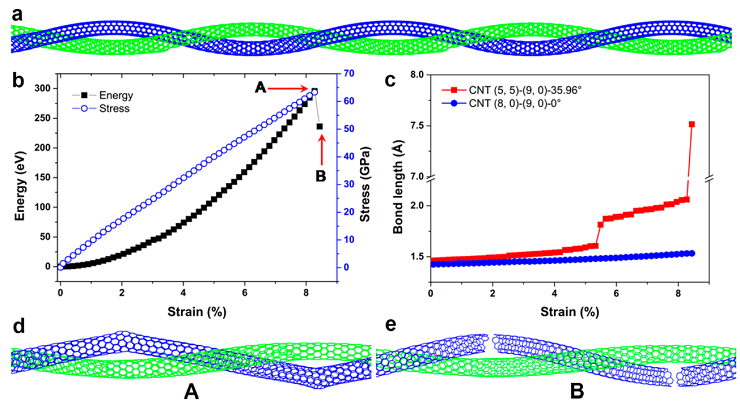 图五:图(a)为由分别为(8,0)-(9, 0)-0°(绿色)和(5,5)-(9,0)35.96°(蓝色)的两条碳纳米管组成的碳纳米管纤维模型。图(b)为碳纳米管纤维的应变能和拉应力对应变的关系曲线图。图(c)为含有七边形缺陷的(5,5)-(9,0)碳纳米管的最长的C−C键的长度与应变的关系曲线图。图(d)和(e)分别为(5,5)-(9,0)碳纳米管纤维断裂前和断裂后的快照。