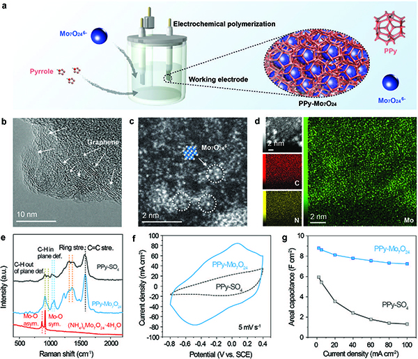 图二 PPy-Mo7O24的结构形貌和电容性能表征