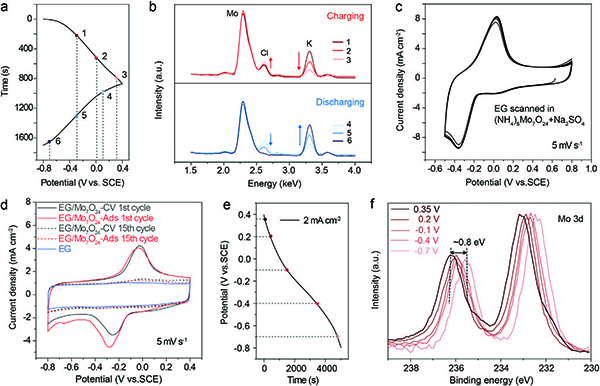 (d)在3 m LiCl中以5 mV s-1扫描的EG,EG/Mo7O24-CV和EG/Mo7O24-Ads的CV曲线。