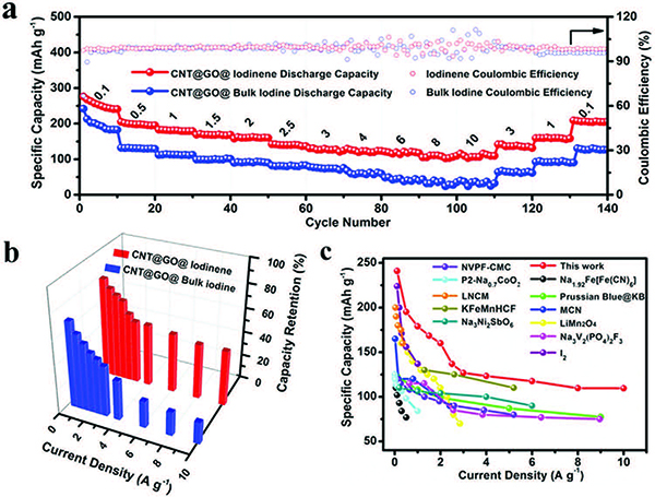 (c)碘烯电极与其他已报道电极材料间的倍率性能对比图。