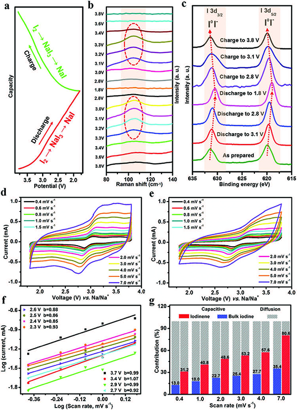 (g)在不同扫描速率下,碘烯和体相碘的赝电容贡献所占百分比。