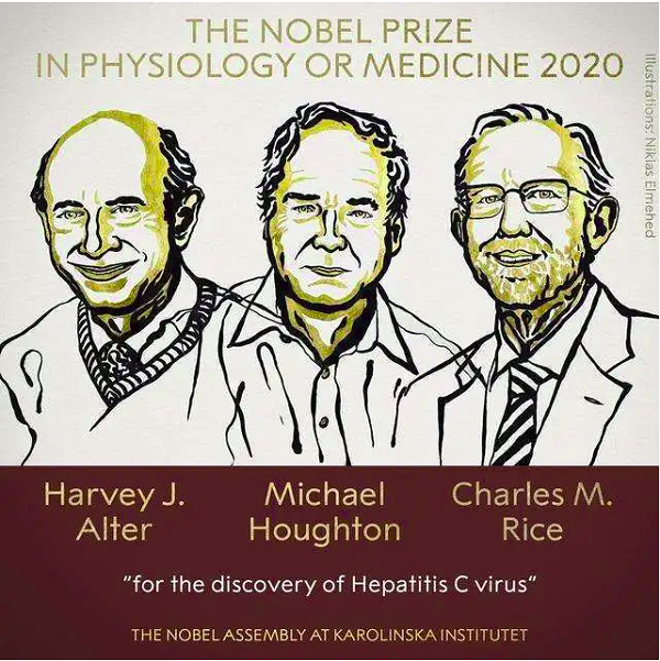 2020年诺贝尔生理学或医学奖颁给了Harvey J. Alter、 Michael Houghton和Charles M. Rice,获奖理由是发现丙型肝炎病毒。