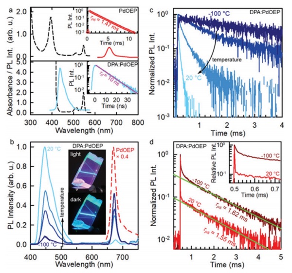a)掺杂PdOEP和DPA:PdOEP掺杂的纳米相分离聚合物的吸收和光致发光(PL)光谱