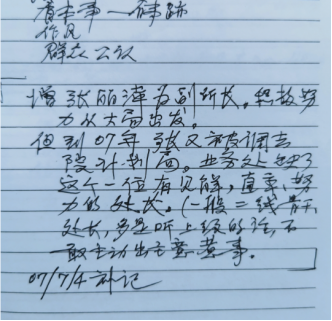 洪先生平时给人的印象是严谨冷漠,有点不食人间烟火的味道,甚至跟他特别近的人,见面时表情也是冷淡的,最多点点头。但他内心里对朋友、同事和家人是非常关心的。2002年一线改革,有些课题组面临解散,有些以前跟他工作的老同志按规定要提前内退,他很焦虑,找我商量怎么办,后来我这吸收了一个课题组和另外两位老同志。2005年力学所前所长薛明伦(张立民的丈夫)的追悼会,洪先生当时也是85岁的人了,我劝他别去了,但他执意要去八宝山参加葬礼,跟我说他很欣赏薛这个人,认为薛作为所长很有自己的管理思想,所以必须去送他一程。他时常跟我说研究所领导一定要有公心,要敢于坚持原则,善于团结大家。他对詹文山非常欣赏,总跟我提起他。洪先生去世后,我在他的工作日记里看到他对张丽萍的评价(见下图),对丽萍的管理能力非常认可。洪先生对有能力又踏实做事的人总是欣赏的。