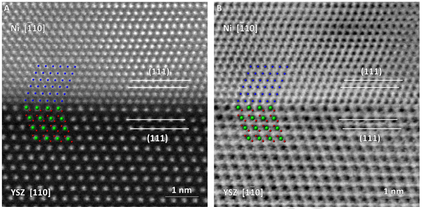 Ni和钇稳定氧化锆(YSZ)的平衡界面是1350℃,氧偏压为10-20atm条件下,Ni薄膜在YSZ单晶的(111)表面通过固态润湿形成的。平衡固-固界面的原子结构借助iDPC-STEM技术来确定。结果显示由于Ni和YSZ重构界面之间发生了大的晶格错配,形成了一种包含高密度失配位错的特殊结构。然而,尽管有大的晶格错配,界面也不是非共格的。界面由阳离子终止,这可能是由于低氧偏压下达到平衡导致的。