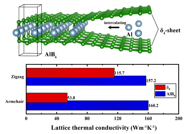 团队通过第一性原理和声子玻尔兹曼输运理论的方法,研究了δ4硼烯与AlB6的声子扩散输运性质。发现了,在室温下AlB6在扶手椅方向热导率可达δ4硼烯的三倍。AlB6中由原子嵌入导致的声子非谐性减弱为人们调控二维材料热传导性质开创了新的途径。