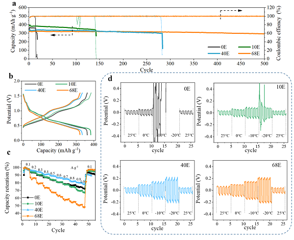 图4.混合电解液的全电池性能和低温性能