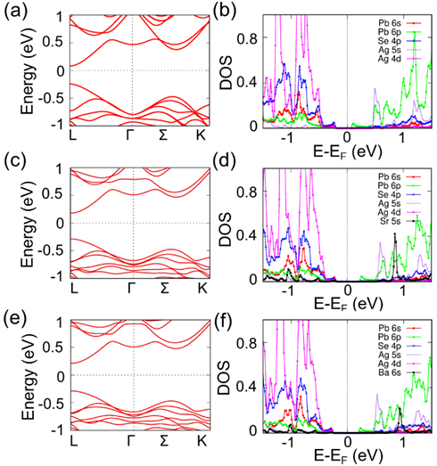 图1. Ag掺杂的PbSe,Ag掺杂和Sr合金化以及Ag掺杂和Ba合金化的PbSe的能带结构和态密度。