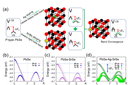 图2. (a)两种化学独立“把手”对PbSe能带结构调控示意图;本证PbSe(b),Sr合金化(c)以及Ag掺杂和Sr合金化(d)PbSe的价带结构。