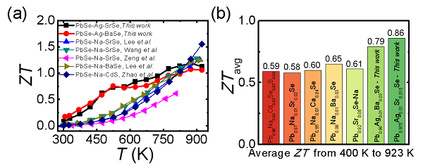 总体而言,Ag掺杂和Sr或Ba合金化不仅可以调控PbSe的能带结构,实现较低温度下的能带收敛,增强电输运性能。同时引入的偏心原子和纳米相强化了声子散射,最终有效提高了p型PbSe的平均热电优值。