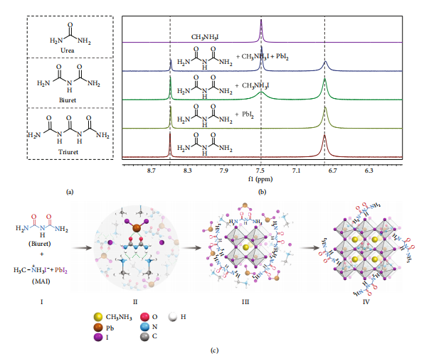 图1:添加剂与钙钛矿前驱体的相互作用:(a)urea、biuret和triuret的化学结构。(b) MAI, MAI+PbI2+biuret, MAI+biuret, PbI2+biuret, biuret的1H NMR谱。(c) MAPbI3钙钛矿晶体在biuret添加剂帮助下的生长示意图,(I)将biuret与钙钛矿前驱体混合,(II)前驱体与添加剂形成PbI2 -biuret- MAI络合物,(III)添加剂吸附在晶核周围,持续吸引游离单体(MAI, PbI2)加速晶体生长,(IV)形成大晶粒钙钛矿并在晶界处残留添加剂。