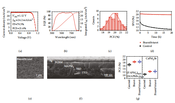 图4:基于biuret/triuret混合添加剂的钙钛矿器件的性能研究。(a)最优器件的J-V曲线和(b)EQE谱。(c)基于biuret/triuret混合添加剂的器件的效率分布柱状图。(d)最优器件和标准器件的20小时稳态输出效率(SPO)对比。(e, f)基于biuret/triuret混合添加剂制备的钙钛矿薄膜的上表面SEM和横截面SEM照片。(g)添加剂对(FAPbI3)0.85(MAPbBr3)0.15与CsPbI2Br钙钛矿器件的光伏性能影响。(器件结构分别为ITO/PTAA/(FAPbI3)0.85(MAPbBr3)0.15/PC61BM/Ag和ITO/NiO/CsPbI2Br/PC61BM/Ag。)