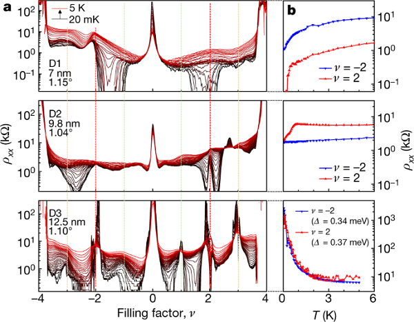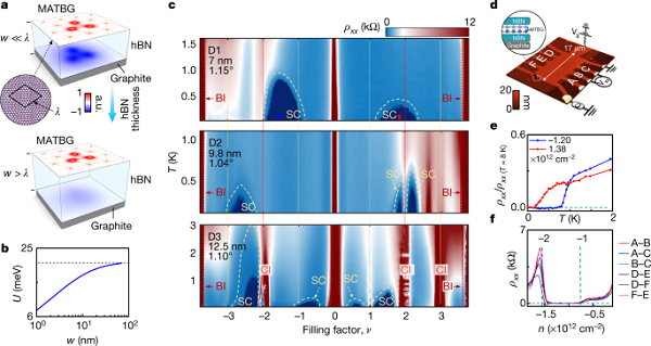 巴塞罗那科学技术研究所Dmitri K. Efetov研究团队报告了通过改变石墨烯与金属屏蔽层之间的分隔距离,来直接调节该系统中电子相互作用的方法。在屏蔽层间距小于15纳米的典型Wannier轨道尺寸,以及扭曲角度略微偏离魔角1.10±0.05度的器件中,研究人员观察到了相关绝缘体的淬灭。绝缘顺序消失后,空出的相空间将由具有临界温度的超导部分所占据,该临界温度可与具有强绝缘体的设备相媲美。此外,还发现半填充状态的绝缘子,会重新出现在0.4特斯拉的小平面外磁场中,从而产生Chern数为2的量化霍尔状态。该研究为理解双层魔角石墨烯中的绝缘态和超导态之间的关系提供了经验,并为理解具备强相互作用的超导体系的微观机制提供了方案。
